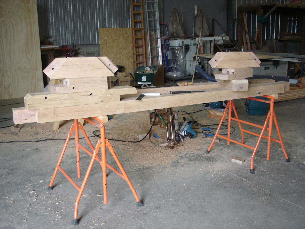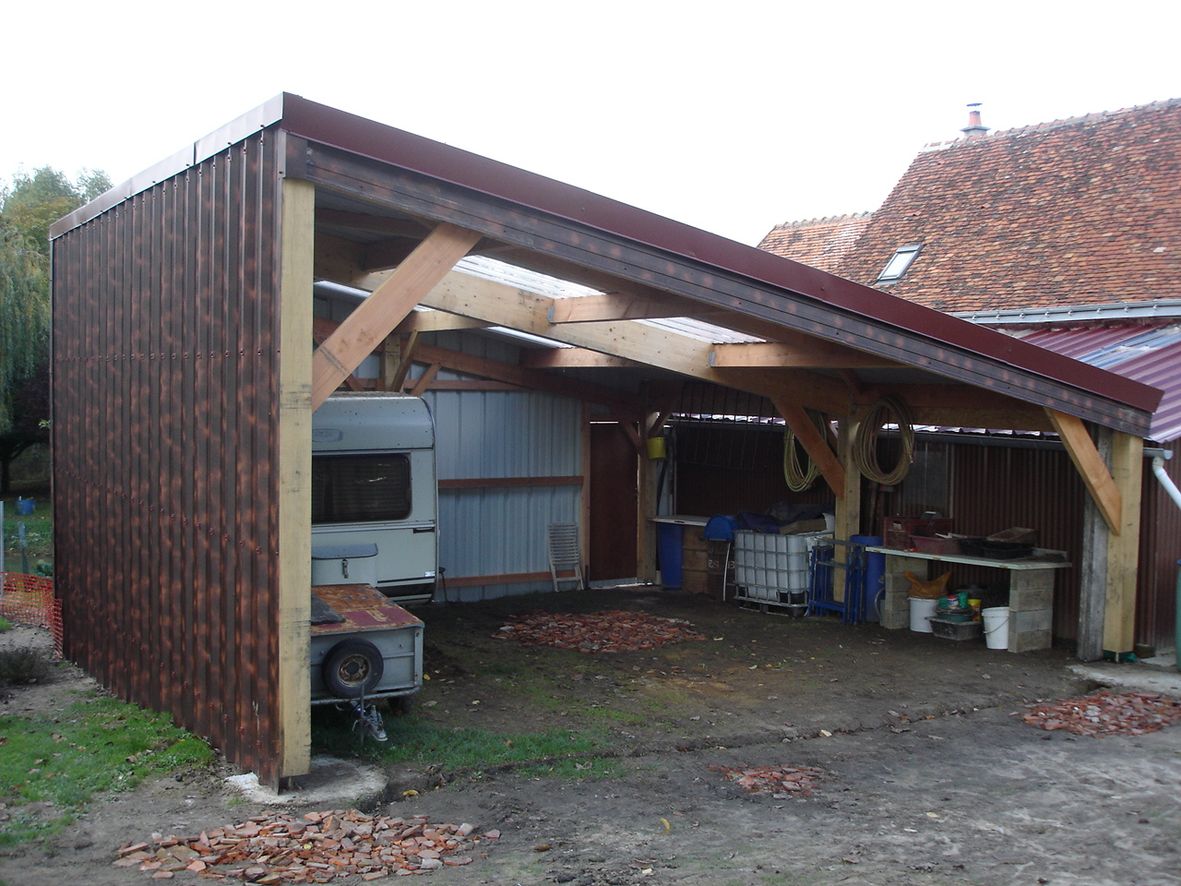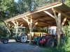 Charpente traditionnelle, poteaux en chêne, autres éléments de charpente en douglas, couverture en bacs acier. Dimensions : 17 x 8 m.