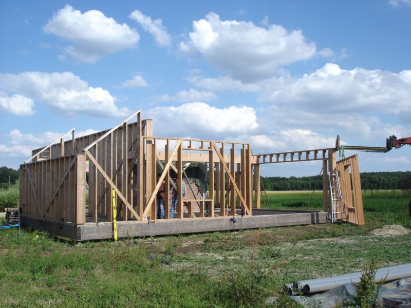 Charpente traditionnelle, poteaux en chêne, arbalétriers en sapin lamellé-collé, autres éléments de charpente en douglas, couverture et bardage en bacs acier. Dimensions : 8 x 7.5 m.
