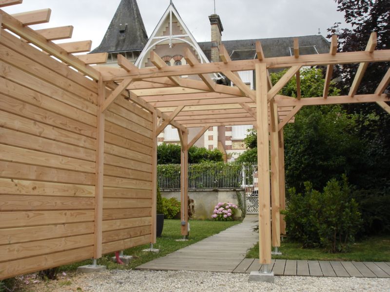 Structure bois en douglas purgé d’aubier non traité. Dimensions pergola : 6 x 4 m, hauteur 2.40 m. Dimensions palissades : 13 ml, hauteur 2.40 m.
